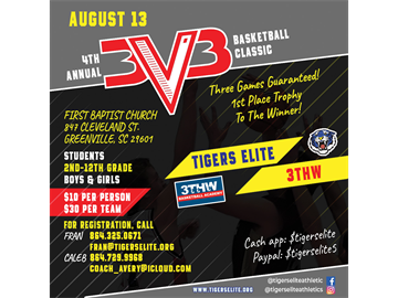 The past 3 years was a great success. This year will be even bigger and better. Tigers Elite & 3THW will be hosting our annual 3v3 on August 13th at First Baptist on Cleveland street. We will have photography and video coverage onsite. Trophies will be given away.